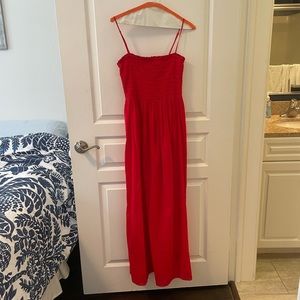 Sleeveless maxi dress featuring thin, adjustable shoulder straps and a smocked bodice. Frilled neckline