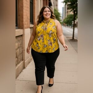 Brighten up your wardrobe with this Torrid sleeveless floral blouse in a vibrant mustard yellow. Features a ruffled mock neckline with a tie-front detail, a flowy fit that hits below the hips, and a beautiful all-over floral print. Gently used with no flaws. Perfect for casual days or a polished career look.