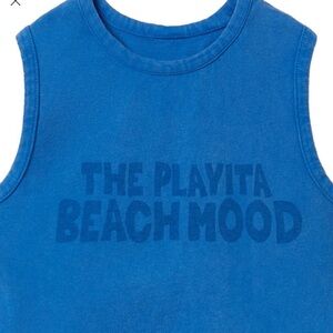 Bright blue tee with bold graphic. Sleeveless design. Perfect for play and casual wear.