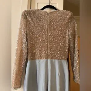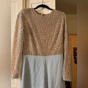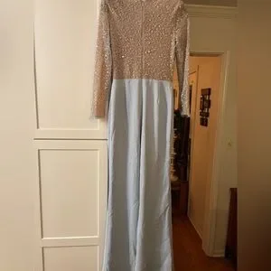 Chic sky blue jumpsuit with sparkling embellishments. Long sleeves and wide-leg design. Ideal for special events. Never worn- reposhing, tried on but was a size 8 & too big. (no belt)..Gorgeous!!