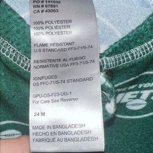 Official NFL Team Apparel NY Jets Onesie. Cozy green footie with NY Jets Logos. Ideal for young fans. Zip up closure with snap button at neck. Size 24 months. 100% polyester.