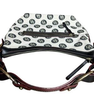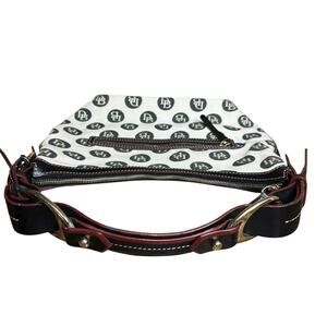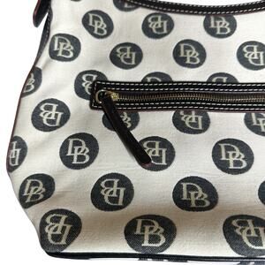 Vtg Dooney & Bourke Monogram Shoulder Bag Purse Ivory Black Leather Trim 10.5x15