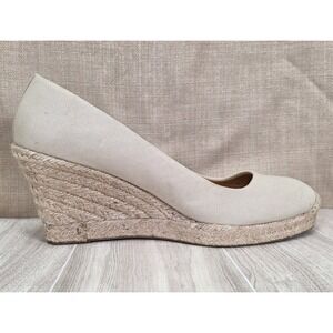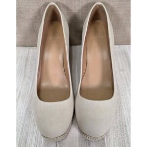 J Crew Beige Cream Canvas Woven Wicker Seville Espadrilles Wedge Heel in size 10.5 are a stylish and versatile option for a variety of occasions. The slip-on design and high wedge heel make them easy to wear and comfortable for all-day use. Women's size 10.5.
