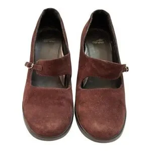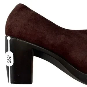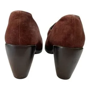 Elegant brown suede heels with a comfortable block heel. Features a stylish strap with a gold buckle.
