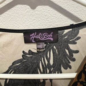 Good condition Hale Bob silk wrap dress feather pattern Small. This is 100 percent silk and has a wrap tie strap. It is embellished. Shown in the photo the back of the dress near the right shoulder there is a small snag.