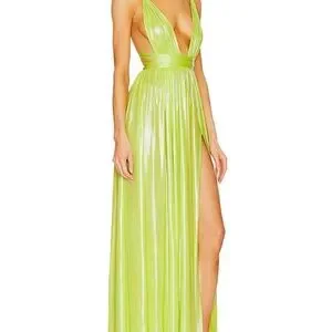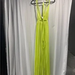 Stunning lime green maxi dress. Features a deep V-neck and high slit. Perfect for elegant occasions.