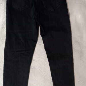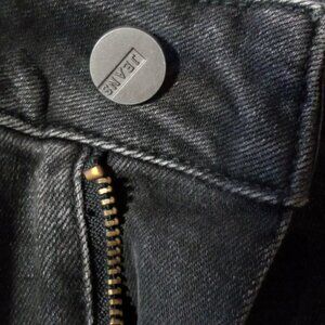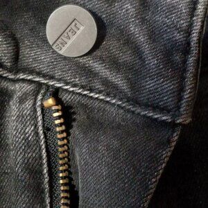 Black stone wash traditional rear unmarked pockets. Branded buttons. Unhemmed bottom.