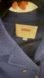 Chic navy pea coat by St. John. Features gold buttons and classic design. Ideal for stylish layering.