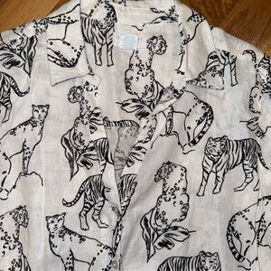 Cynthia Rowley button down 100% linen white top tiger print roll tab sleeve