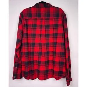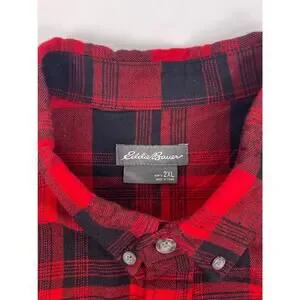 Eddie Bauer red black plaid flannel mens shirt 2XL button up long sleeve 100% cotton classic lumberjack outdoor casual soft brushed winter fall holiday cozy warm large tall relaxed fit