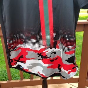 Bold streetwear style with a message—this Contender “Good Young” graphic shirt in size 2XL combines comfort and edge. Featuring a sleek black body, red & green central stripes, and a standout red/gray camo hem design, this shirt delivers an urban athletic vibe. Great for casual wear, lounging, or a standout weekend look.