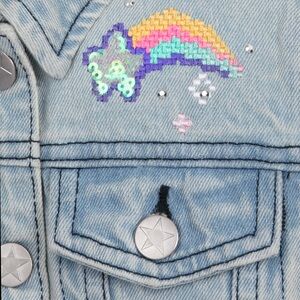 The inside collar reads “Made of Stars,” and the jacket includes classic denim details like button cuffs, two chest pockets, and two side pockets. Perfect for layering over dresses or pairing with jeans for everyday adventures—or for wearing to Disney parks!