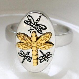 🌸 Sterling Silver Vintage Oval Golden Dragonfly Signet Ring