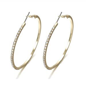 Be a total glam goddess in these super trendy oversized gold hoop earrings. Featuring a super sleek, thin hoop with dozens of faceted crystal rhinestone embellishments. Ultra shiny gold hardware. Hinged leverback earring closure. Add some bling to your look with these super sexy crystal hoop earrings ❤️