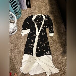 Elegant black wrap dress with floral pattern and white accents. Perfect for any occasion.