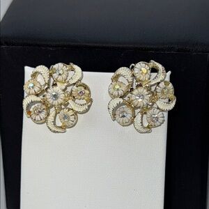 Vintage gold tone ivory swirl and iridescent aurora borealis clip earrings beachy