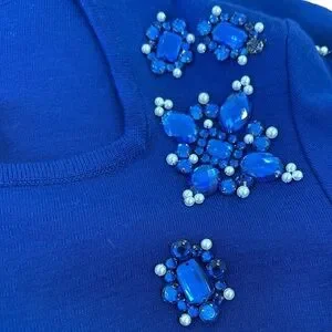 Tags: Vintage, 90s fashion, bodycon dress, knit dress, royal blue, gem accents, jewels, pearls, sparkle, party dress, statement piece, glam, Y2K vibes, unique, rare, elegant, winter cocktail, cozy chic