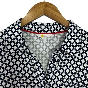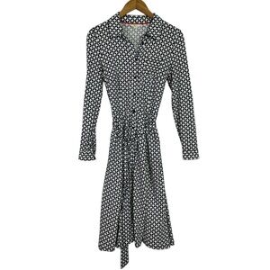 Stylish midi dress by Boden. Features a black and white pattern. Long sleeves with a belted waist. Perfect for any occasion.