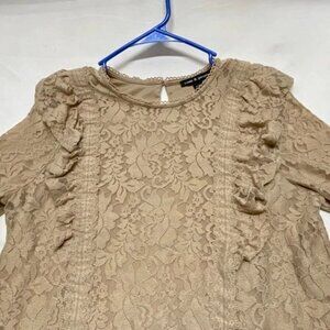 Cable & Gauge Women's Medium Tan Lace Blouse Sheer Sleeves Ruffled Front Boho
