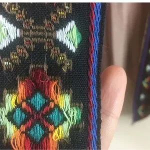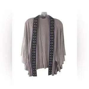 Stylish tan kimono with colorful embroidered trim. Perfect for layering.