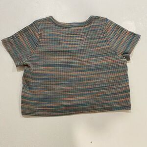 Effortlessly cute and comfy Madewell cropped tee with a multicolor striped ribbed knit design and flattering V-neckline. Soft stretch fabric gives that lived-in, easygoing feel — perfect for casual days, layering, or pairing with high-waisted jeans and skirts. Excellent condition with no flaws noted.