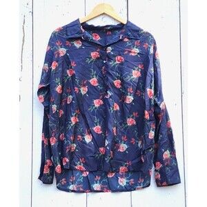 Johnny Was Women Navy Rose Collared Long Sleeve Silk Button Up Shirt L / XL READ