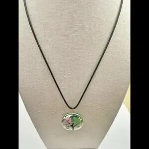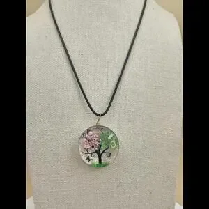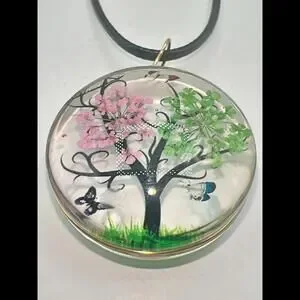 Add a touch of nature to your style with this exquisite Botanical Tree and Butterflies Pendant Necklace. Featuring a beautifully crafted design encased in clear resin, this necklace showcases a charming tree adorned with delicate pink flowers, and vibrant green leaves, alongside intricate details of butterflies and grass. Perfect for any occasion, it makes a thoughtful gift for nature lovers and fashion enthusiasts alike.
