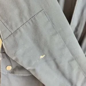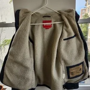 Durable blue jacket with hood. Features multiple pockets and button closures. Ideal for outdoor activities.