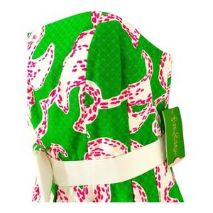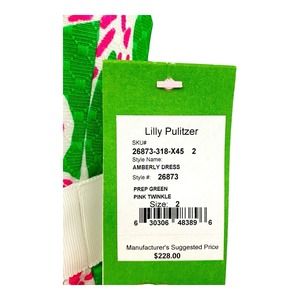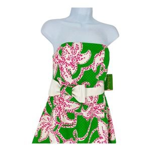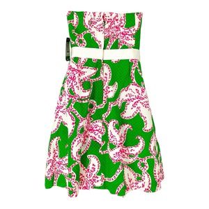 This Lilly Pulitzer Amberly Twinkle dress features a beautiful floral pattern in shades of green and pink, perfect for summer occasions such as weddings, parties, and formal events. The strapless design showcases the dress's fit and flare style, while the zipper closure adds a touch of practicality.