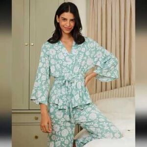 Relax in style with this elegant floral print kimono pajama set. The soothing green and white colors offer a fresh look, perfect for lounging. Enjoy comfort and elegance in this beautifully designed sleepwear.