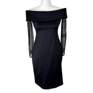 Make a statement in this classic Calvin Klein cocktail dress. Off the shoulder (with silicone stripping all around neckline to keep it in place) and sheer mesh sleeves, exposed gold tone rear zip closure with logo engraved zipper pull. Cut to enhance your curves. Polyester/Spandex Mesh. Dry clean. Worn just once to a party. Approx 15" armpit to armpit, 38" mid-shoulder to hem, waist measures approx 14" seam to seam when lying flat, hip measures approx 17" seam to seam when lying flat.