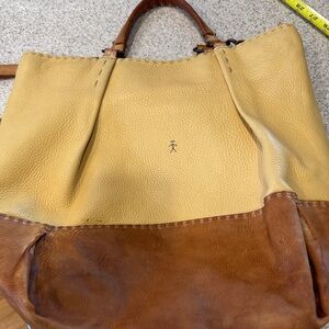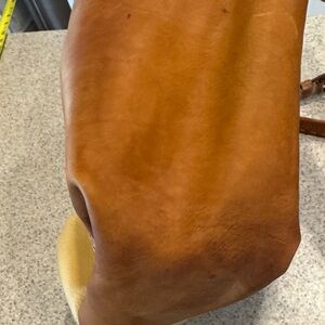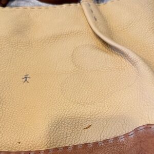 Elevate your style with this chic tan and brown leather tote. Perfect for daily use, it combines elegance with practicality. This is one of those bags that just get better with age! You can fit your whole day it! There are signs of wear and some stains- I have not tried to clean them.