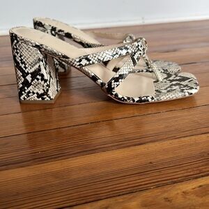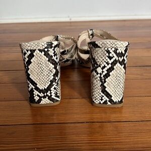 These H by Halston summer heeled sandals feature a sophisticated snakeskin design. The slip-on thong style makes them a versatile choice for various occasions. Block heel. Faux Leather. New without box. Runs slightly large.