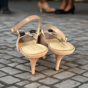 Step out in style with these elegant tan slingback heels. Featuring a chic bow accent, these shoes are perfect for any occasion. The neutral tan color complements any outfit.