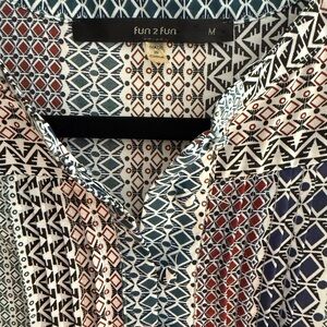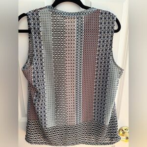 Boho-chic meets fall fashion in this sleeveless button-down top! Features a beautiful geometric print in rich, earthy tones of navy, dark green, burnt orange, and black—perfect for the season. 🍁