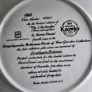 The Chickadee is number four in the Encyclopedia Britannica Birds of Your Garden Collection. The beautiful artwork is done by Kevin Daniel. Presented by Knowles fine china in a limited edition firing of 100 firing days.