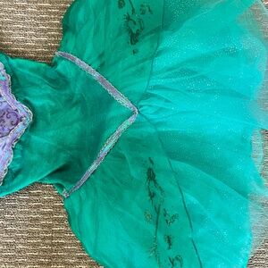 Little girls little mermaid dress perfect for next Halloween or just for dress up Disney princess has a zip back normal wear and tear see photos for minor stain unsure if it’ll come out and wash near stomach chest area on purple no size tag would say fits best for a 6/7 or size 7