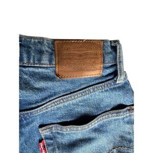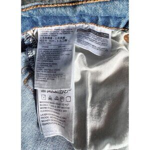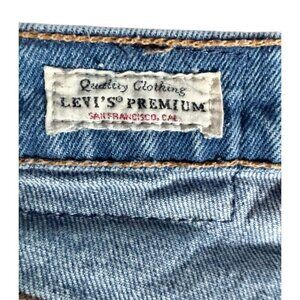 Levi's Premium Ribcage Straight Denim Jeans. Jean have a high rise waist and a button fly closure. They're made of a cotton elastane blend and are a woman's size 27.