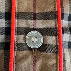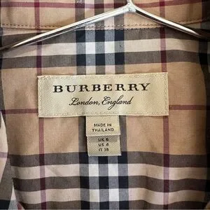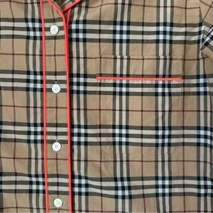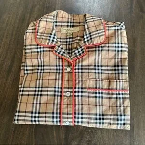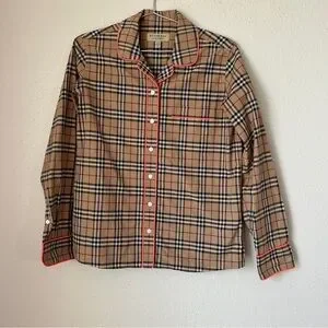 Stylish Burberry button-up shirt in a classic tan plaid pattern with pink accents. Features a front pocket and button closure.