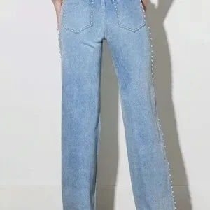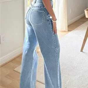 Stylish light blue flared jeans with studded details. Perfect for a chic and comfortable look.