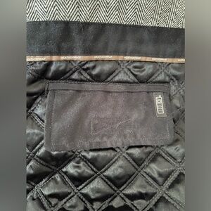 Soft comfy Weatherproof jacket with 2 outside pockets and 2 Velcro pockets inside. Casual or dressy for evening. Blue microsuede with a brown collar.