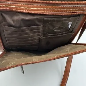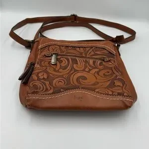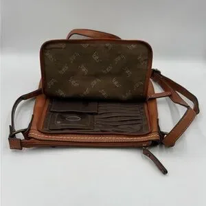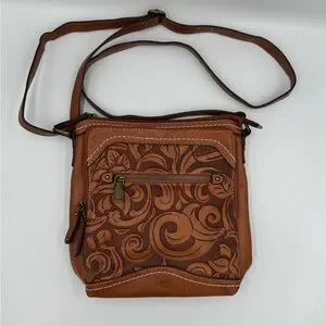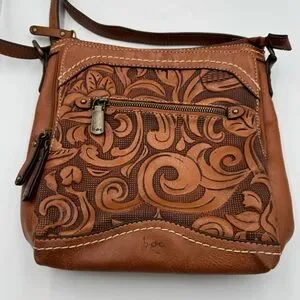 Beautiful faux leather crossbody bag. Measures approximately 10”x9” with an adjustable strap. Has a front zipper pocket. A second section with credit card slots and phone pocket. The main compartment is deep with a zipper pocket. In very good condition Very clean