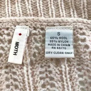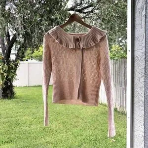 Anthropologie Moth Women’s Size Small, Ruffled Collared, Tan, Blush, Nude, Crochet Cardigan Sweater, 65% Wool, 35% Nylon, Button Down, In good used condition.