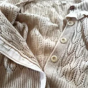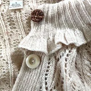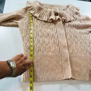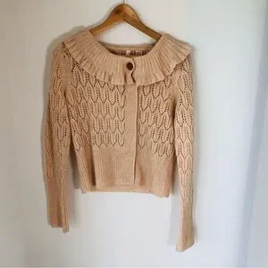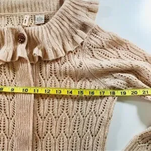 Anthropologie Moth Women’s S, Ruffled Collar, Tan Crochet Cardigan Sweater, Wool