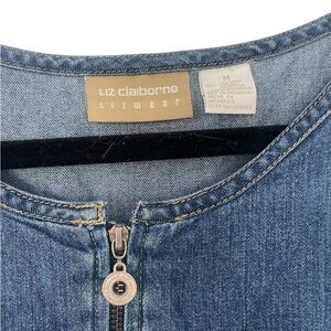 Chic denim dress with a front zipper. Features a round neckline and casual style.