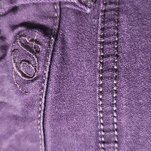 Chic and versatile dark purple jeans with unique fleur de lis embroidery and beads. Perfect for casual or dressy affairs.