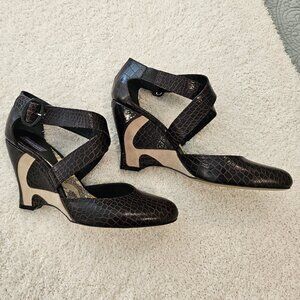 Gorgeous wedge heel by Emilio Pucci, EU size 39 with 4" heel, worn only once. Other than a very small amount of wear on sole they are in perfect condition. Rich brown embossed leather and cream color suede with cross straps/buckle and rounded toe. Stunning and unique design.