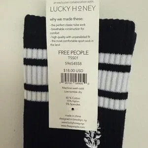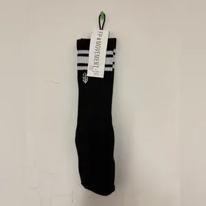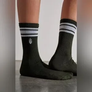 Black ribbed crew socks with white stripes. Stylish and comfortable for athletic wear.