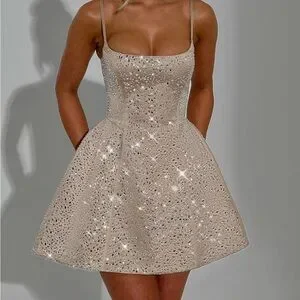 Shine in this elegant cream dress adorned with sparkling rhinestones. Perfect for special occasions.