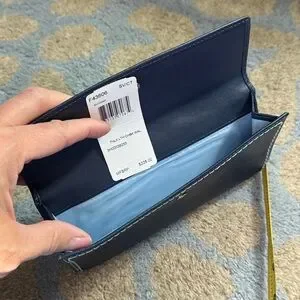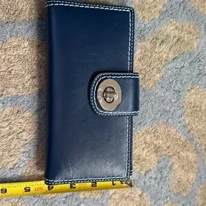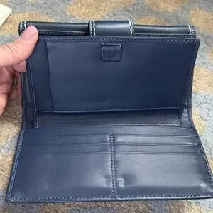 Elegant navy leather wallet by Coach. Accented with grey stitching. Traditional check book cover insert which can be removed. Clutch style so it all you need to go out, but easily slips into a larger purse or tote. 8”x4”